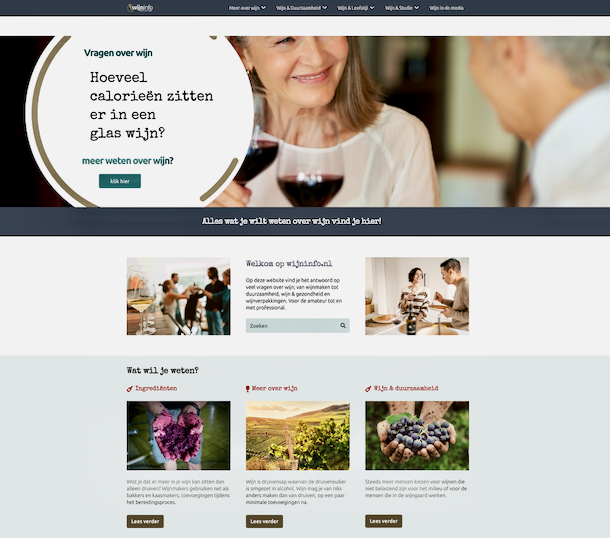 WIJNINFO.NL bevat objectieve informatie over wijn en alles wat daarmee te maken heeft. De onderwerpen variëren van uitleg over wijn maken, via Europese wijnwetgeving naar wijn in relatie tot duurzaamheid en gezondheid. Wijnartikelen vanuit de landelijke pers zijn ook op WIJNINFO.NL te vinden.